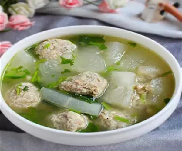 原料:猪肉馅150克,冬瓜150克,蛋清1枚,料酒1茶匙(5毫升),姜末1茶匙(3克),姜片2片,盐2茶匙(10克),鸡精1/2茶匙(3克),香菜3克,香油1茶匙(5毫升)。