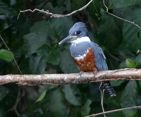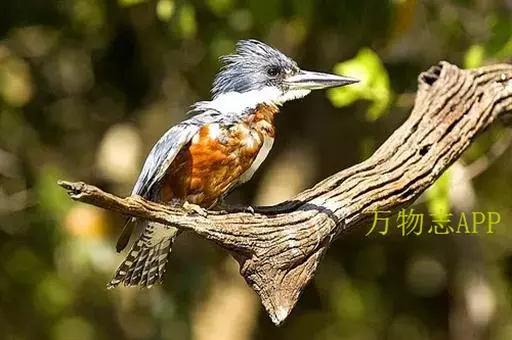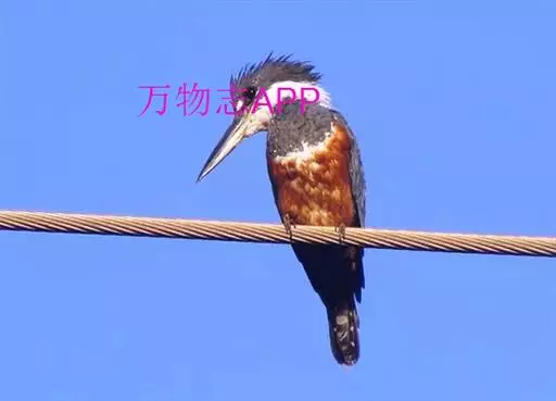 棕腹鱼狗身长38 - 42 cm ,体重305-341 g。主体羽毛蓝色。头顶的冠羽竖起一个小尖峰…
