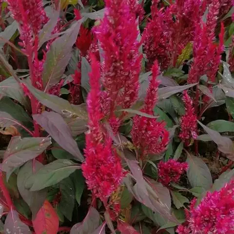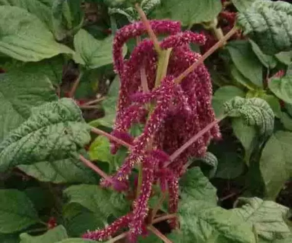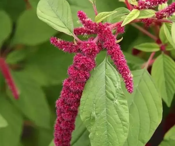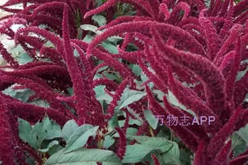 尾穗苋(Amaranthus caudatus L.)苋科一年生草本,高达1.5米;茎直立,粗壮,具钝棱角,单一或稍分枝,绿色,或常带粉红色,幼时有短柔毛,后渐脱落。叶片菱状卵形或菱状披针形,顶端短渐尖或圆钝,具凸尖,基部宽楔形,稍不对称,全缘或波状缘,绿色或红色,除在叶脉上稍有柔毛外,两面无毛;胞果近球形,直径3毫米,上半部红色,超出花被片。种子近球形,直径1毫米,淡棕黄色,有厚的环。花期7-8月,果期9-10月。