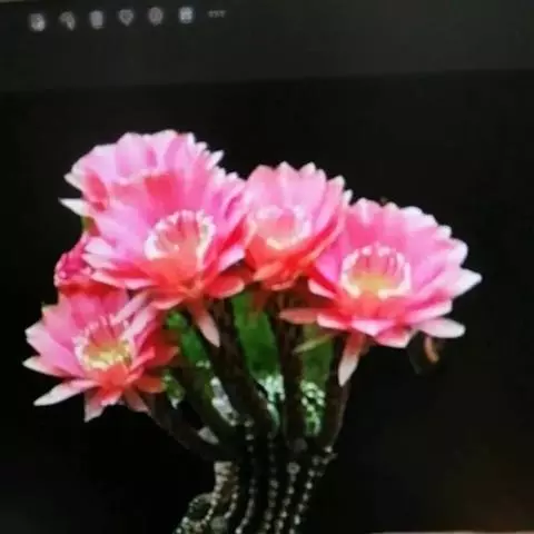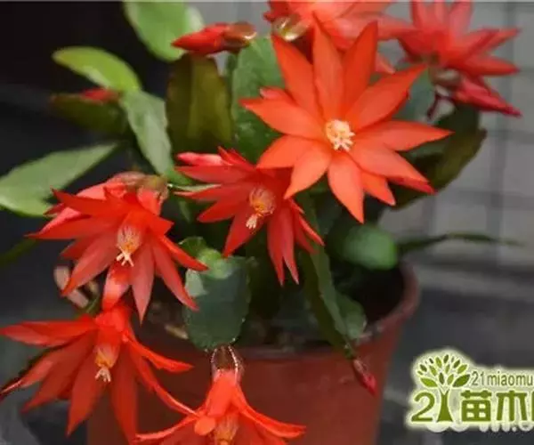 仙人指。花瓣为多层,规则而又整齐。雌蕊红色,雄蕊白色,均较长,伸出花筒外,与蟹爪兰相类似。花色为玫瑰红色。
