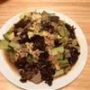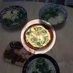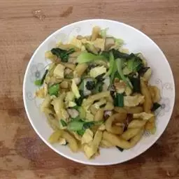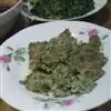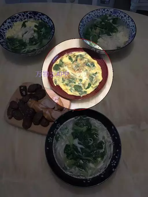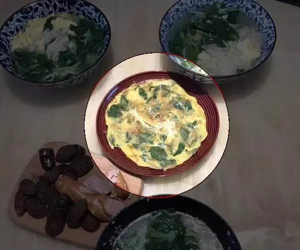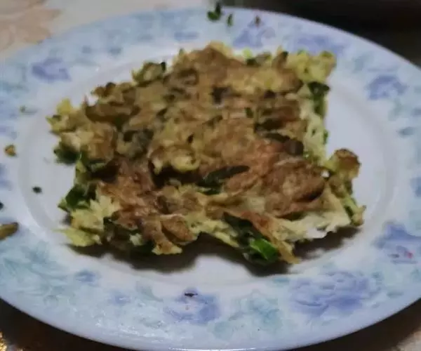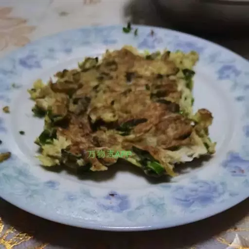 最后将一件好的"薄饼"翻过来放上鸡蛋、青菜,将正反两面煎熟,吃时淋上材料 3 调成的酱汁即可。