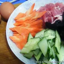鸡蛋打散,香葱切碎,胡萝卜去皮、擦丝;