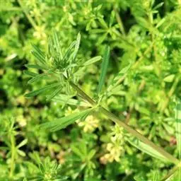 【药材识别】本品根细小。茎呈四棱柱形,多分枝,长20~30cm,直径约lmm, 猪殃殃 灰绿色或绿褐色,棱上有侧生剌毛;质脆,易折断,断面中空。叶6~8片轮生,无柄,叶片多卷缩或破碎,完整者线状披针形或近倒披针形,长1~5.5cm,宽0.2~1cm,边缘及下面中脉有倒生刺毛。聚伞花序腋生或顶生,花小,易脱落。果小,由2个球形分果片组成,绿褐色,密生白色钩毛。气微,味淡。