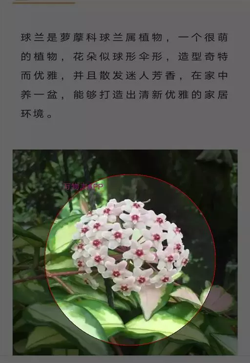 叶对生,卵圆形至卵圆状长圆形,长3.5-12厘米,宽3-4.5厘米,顶端钝,基部圆形;侧脉不明显,约有4对。聚伞花序伞形状,腋生,着花约30朵;花白色,直径2厘米;花冠辐状,花冠筒短,裂片外面无毛,内面多乳头状突起;副花冠星状,外角急尖,中脊隆起,边缘反折而成1孔隙,内角急尖,直立;花粉块每室1个,伸长,侧边透明。蓇葖线形,光滑,长7.5-10厘米;种子顶端具白色绢质种毛。花期6-8月,果期7-8月。