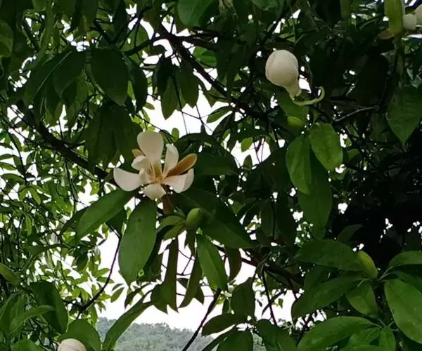 “木莲树生巴峡山谷间,巴民亦呼黄心树。大者高五丈涉冬不凋。身如青杨,有白纹,叶如桂,厚大无脊。花如莲,色香腻皆同,独房蕊有异。四月初开,自开迨谢仅二十日,忠州西北十里,有鸣玉溪生者,茂尤异。惜其遐僻,因题三绝句云:如折芙蓉栽旱地,似抛芍药挂高枝。雪埋水隔无人识,惟有南宾太守知。”