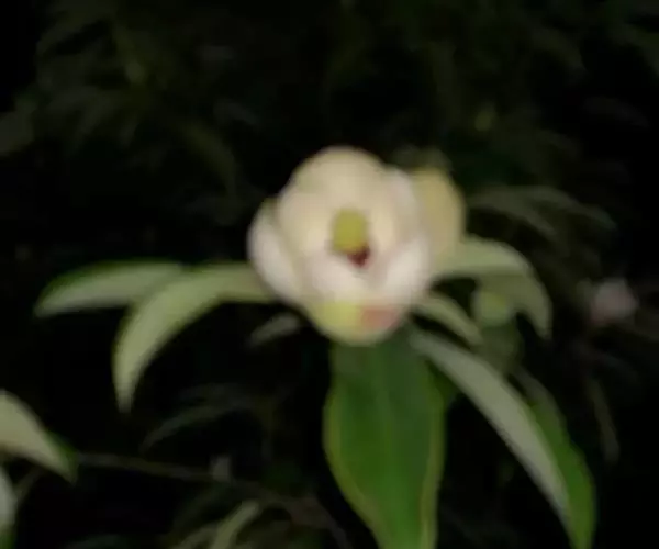 总花梗长6-11毫米,径6-10毫米,具1环状苞片脱落痕,被红褐色短柔毛。花被片纯白色,每轮3片,外轮3片质较薄,近革质,凹入,长圆状椭圆形,长6-7厘米,宽3-4厘米,内2轮的稍小,常肉质,倒卵形,长5-6厘米,宽2-3厘米;雄蕊长约1厘米,花药长约8毫米,药隔钝;雌蕊群长约1.5厘米,具23-30枚心皮,平滑,基部心皮长5-6毫米,宽3-4毫米,中部心皮露出面宽约5毫米;花柱长约1毫米;胚珠8-10颗,2列。