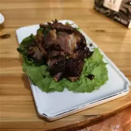 3、沙锅中垫竹箅,肉皮朝上放入锅内,加入猪肉汤、葱结、姜片、绍酒、盐、红曲米水、茴香,加盖烧约30分钟,放冰糖,再加盖转小火焖1小时至酥烂,再加入剩余冰糖、味精,转中火烧至卤汁浓稠,离火,拣去葱、姜,去掉肋骨,放入盘中,皮朝上,浇上原卤汁。