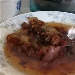 4、原炒锅烧热,放入芝麻油,四成热时,放入番茄酱,待油炒至呈红色时,放入肉块,加入鸡汤、料酒、葱姜末、白糖、醋、盐、味精、樱桃汁,用小火煨15分钟,再用旺火至汤汁浓厚,出锅,装盆。