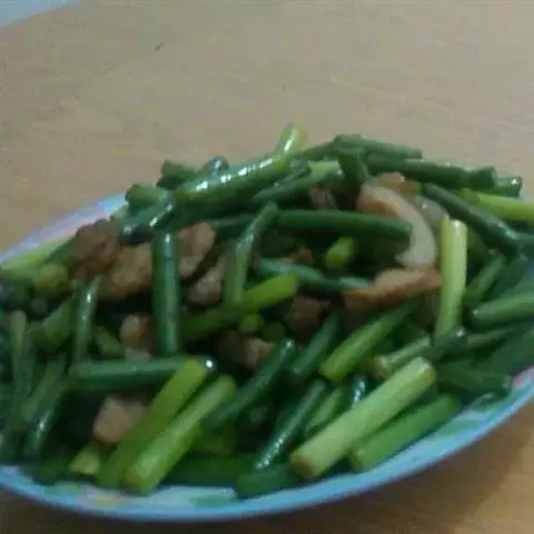 原料:猪五花条肉400克,绿叶菜200克。