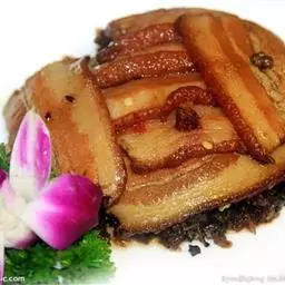 2、炒锅内铺上葱姜,将肉皮朝下放在姜葱上,加绍酒、白糖、酱油、精盐1.5克、肉汤200克,加盖用旺火煮沸,置小火上烧约半小时,加入红曲米粉,使肉呈深红色,捞出装在碗内,加原汁汤,上蒸笼旺火蒸酥为止。