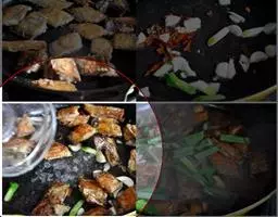 5.洋葱切片,锅中加入适量的底油,放入洋葱片和香菜小火翻炒,炒香待洋葱变得焦黄,香菜变蔫盛出不要。