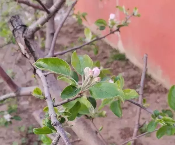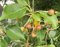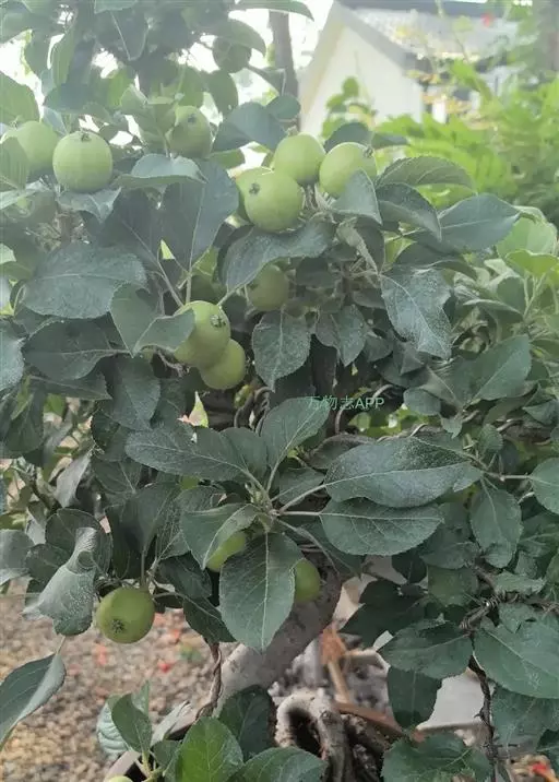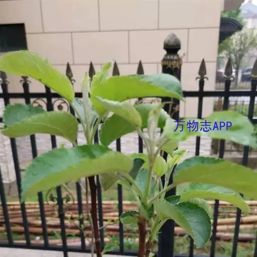 蔷薇科 ,苹果 属落叶乔木,高达15米,树干灰褐色,老皮有不规则的纵裂或片状剥落,小枝幼时密生绒毛,后变光滑,紫褐色。叶序为单叶互生,椭圆形到卵形,长4.9~10厘米,先端尖,缘有圆钝锯齿,幼时两面有毛,后表面光滑,暗绿色。花白色带红晕,径3~5厘米,花梗与花萼均具有灰白色绒毛,萼叶长尖,宿存,雄蕊20,花柱5,大多数品种自花不育,需种植授粉树。果为略扁之球形,径5厘米以 上,两端均凹陷,端部常有棱脊。花期4~6月,果期7~11月果熟。
