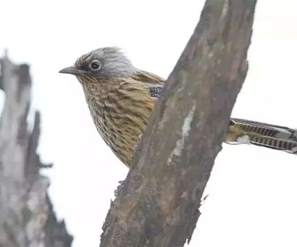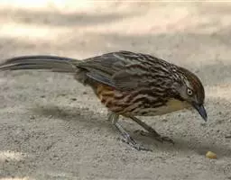 大草鹛中型鸟类,体长31~34厘米。上体灰色具粗著的黑褐色条纹,腰和尾上覆羽纵纹不明显。颊和耳羽灰色,…