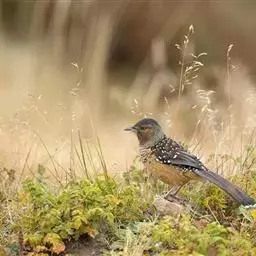大噪鹛:中型鸟类,体长32-36厘米。额至头顶黑褐色,背栗褐色满杂以白色斑点,…
