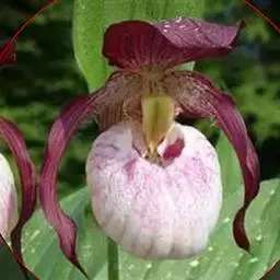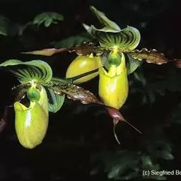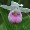 斑叶杓兰(学名:Cypripedium margaritaceum Franch.):植株高约10厘米,地下具较粗壮而短的根状茎。茎直立,较短,顶端具2枚叶。叶近对生,铺地;叶片宽卵形至近圆形,上面暗绿色并有黑紫色斑点。花序顶生,具1花;花较美丽,萼片绿黄色有栗色纵条纹,花瓣与唇瓣白色或淡黄色而有红色或栗红色斑点与条纹;花瓣斜长圆状披针形,向前弯曲并围抱唇瓣,长3-4厘米,宽1.5-2厘米,先端急尖,背面脉上被短毛;唇瓣囊状,近椭圆形,腹背压扁。花期5-7月。