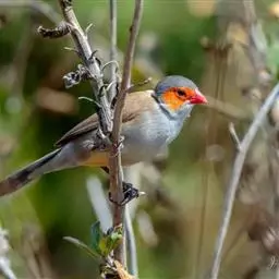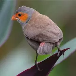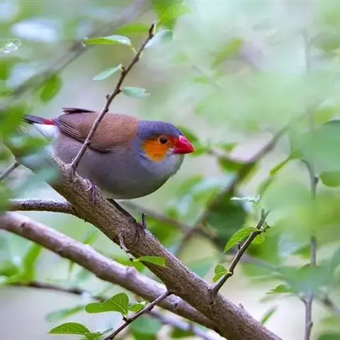 橙颊梅花雀体长约10厘米,头部灰色,两侧有大块橙色区域,嘴基及眼下方有黑纹,两条黑纹间呈白色,…