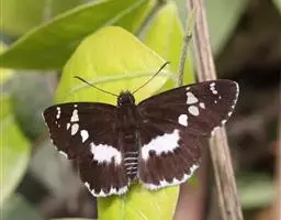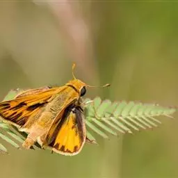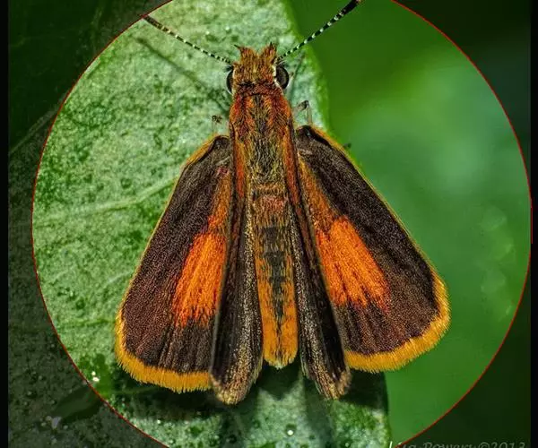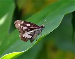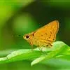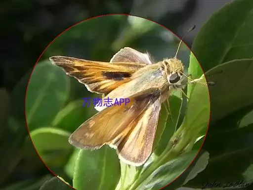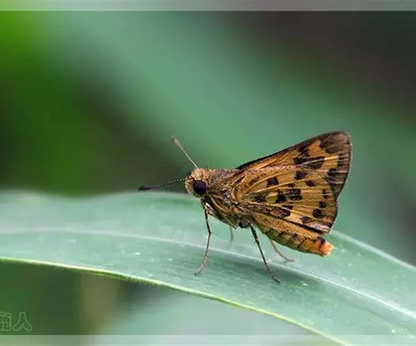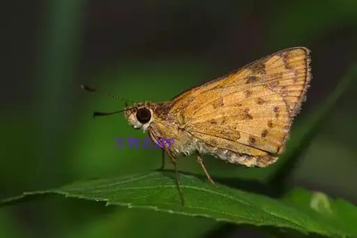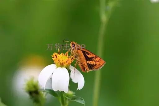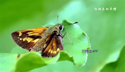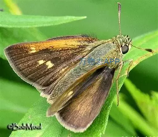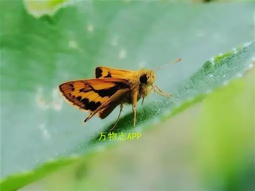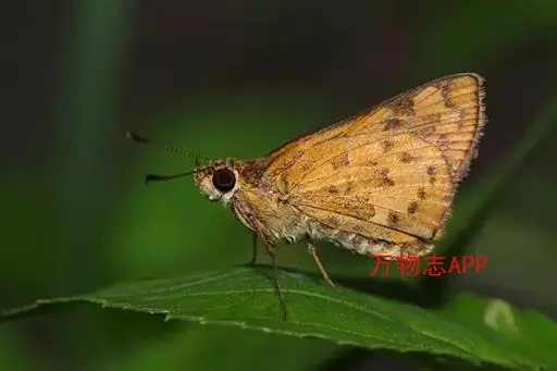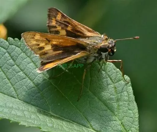 弄蝶科,展翅25 - 30 mm, 翅膀表面底色黑褐色,近后缘有一条橙黄色宽广的横带,翅腹面黄褐色具稀疏的黄斑,斑纹为近似种中较不明显。本种分布於平地至低海拔山区,常见於阳光下访花吸蜜,数量很多,为常见的种类。