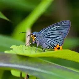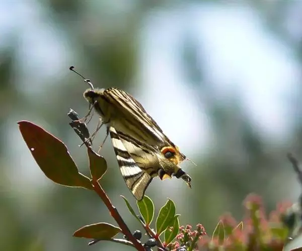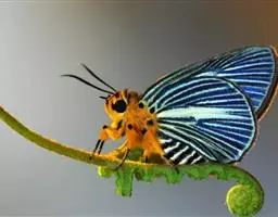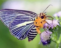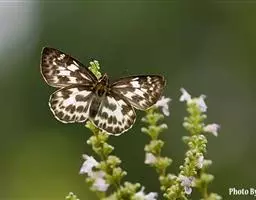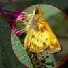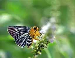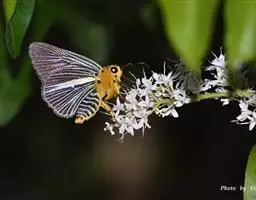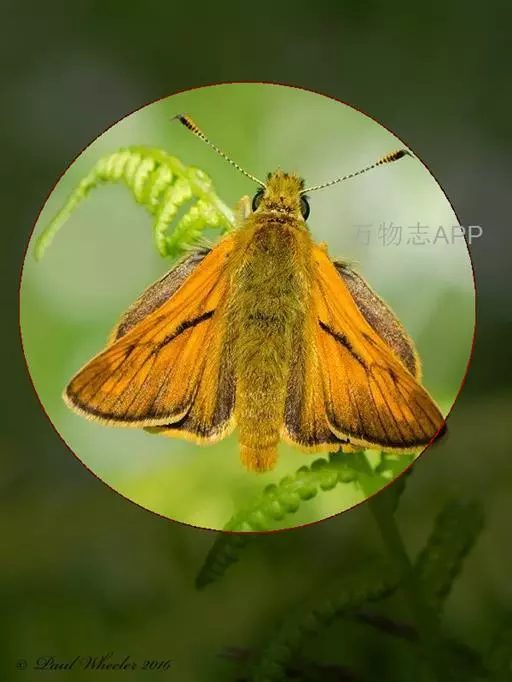 端及第七翅室中部。 雌蝶前翅长为11一 15毫米, 后翅长为 .8 , 毫米左右 ,翅面斑纹与雄蝶基本相同 , 只是前翅前缘下方的黄色条斑不太明显。 雌雄蝶后翅底面均为黄色,上有黑点数个 ,翅外缘均附有黄色缘毛。