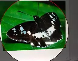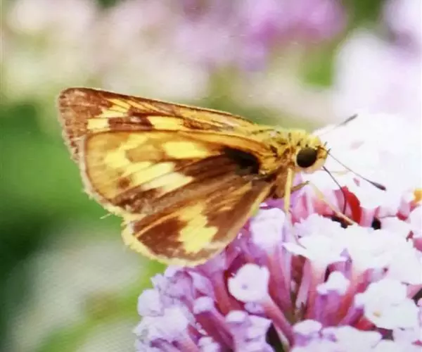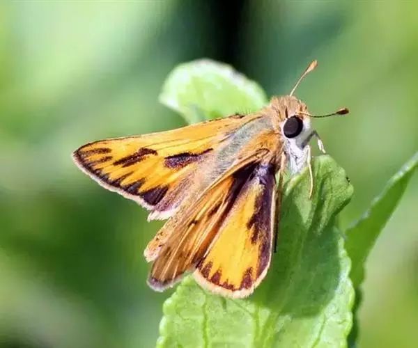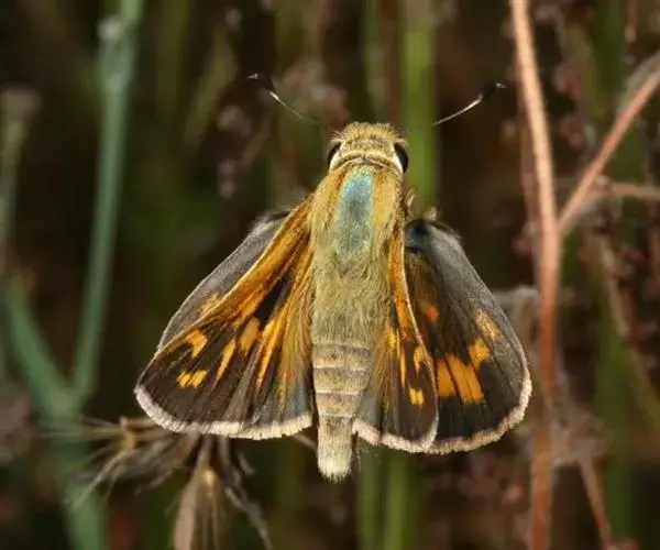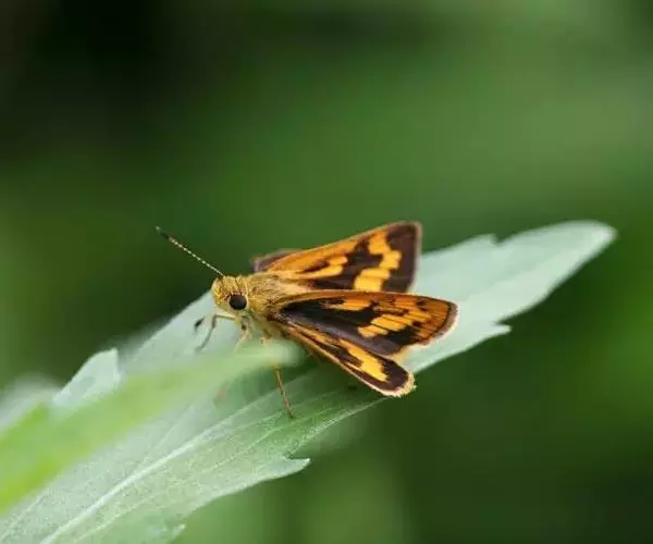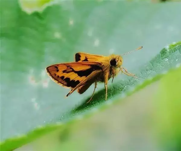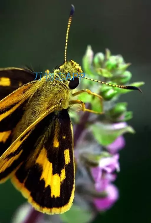 本种为小型种。 体长12一14毫米,头色黑褐, 复眼深黑色,具反光。 触角长约 7 毫米左右 。 丝状部分黄黑相间 , 棒状部的背面全黑,腹面全黄, 顶端有弯钩 , 几 为全黑色。 雄蝶前翅长为12毫米,翅面深黑,黄斑宽阔, 翅前缘下方和翅后缘上方各有一长条形黄色条斑一枚, 别卜在前翅中室内具有大型近似扁月形的黄斑一枚。 翅背面的黄斑略同翅面 , 后翅长 9.5毫米, 翅面黑色, 中域区饰有宽阔的一字黄斑一枚 , 其上方具有黄色圆点二枚, 分别位于中室外
