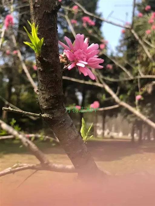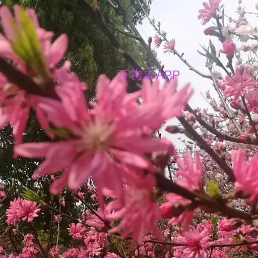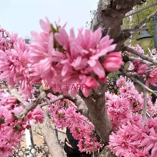 直枝桃类。树势中等;干皮深灰色,小枝细长柔弱,黄褐色,节间较长,2.3厘米。花粉色;花蕾卵形;花瓣披针卵形,不规则扭曲,边缘呈不规则的波状,长2.13厘米,宽0.6厘米;花径4.53厘米,复瓣,菊花型,花高2厘米;花瓣数29枚(22-32),雄蕊数平均32.7,花丝长1厘米,花丝卷曲,有瓣化现象,花药黄色;雌蕊略高于雄蕊;着花中等;花萼红褐色偏绿,两轮;花梗长0.43厘米。叶绿色略显灰,边缘略卷,椭圆披针形,长10.2厘米,宽2.82厘米,叶长与叶宽比(L/W)为3.62;叶缘细锯齿,叶柄0.92厘米;肾形蜜腺2-3个。果实绿色,尖圆形,长4.02厘米,宽3.05厘米;果核长2.92厘米,宽1.56厘米,椭圆形;核面粗糙。花期4月中旬。