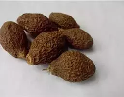 冬葵子果实由7-9个小分果组成,呈扁平圆盘状,底部有宿存花萼。分果呈橘瓣状或肾形,直径1.5-2mm,较薄的一边中央凹下。果皮外表为棕黄色,背面较光滑,两侧面靠凹下处各有一微凹下圆点,由圆点向外有放射性条纹。种子橘瓣状肾形,种皮黑色至棕褐色。质坚硬,破碎后子叶心形,两片重叠折曲。气微、味涩。