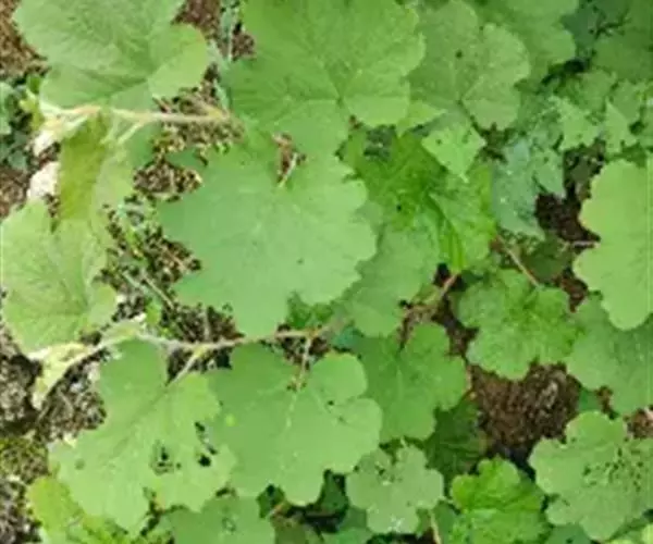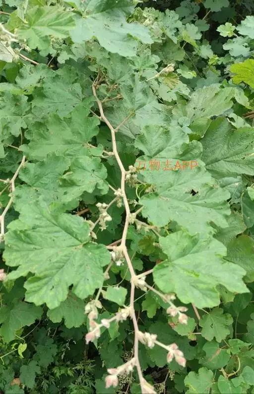 落叶灌木,高2-3米;小枝圆柱形,密被淡黄色绒毛状柔毛,老时脱落,无刺。叶子直径7-15厘米,顶端圆钝或近截形,基部心形,上面粗糙,无毛或仅沿叶脉稍具柔毛,下面密被灰白色绒毛,有时绒毛逐渐脱落,叶脉突起,基部具掌状5出脉,侧脉2-3对,边缘5-7浅裂,裂片圆钝或急尖并再浅裂,有不整齐浅钝锯齿;叶柄长5-7 厘米,具浅黄色绒毛状柔毛,常无刺;托叶离生,卵状披针形,顶端条裂,早落。花成狭圆锥花序,顶生或腋生或花少数簇生于叶腋;总花梗和花梗均密被浅黄色绒毛状柔毛;花梗长约1厘米;苞片与托叶相似;花直径1-1.5厘米;花萼外密被浅黄色绒毛和柔毛;萼片卵状披针形,顶端尾尖,全缘或外萼片顶端浅条裂,在果期直立,稀反折;花瓣倒卵形或近圆形,紫红色,基部具爪,比萼片短很多;雄蕊较短,花丝线形;雌蕊无毛,花柱比雄蕊长。果实直径约1厘米,黑色,无毛,常包藏在宿萼内;核较光滑。花期7-8月,果期9-10月。
