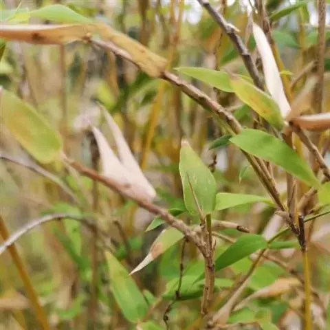 末级小枝具2或3叶;叶耳不明显,有脱落性鞘口繸毛;叶舌稍伸出;叶片质薄,长7-10厘米,宽约1.2厘米。花枝呈短穗状,长3.5-5厘米,基部托以4-8片逐渐增大的鳞片状苞片;佛焰苞4-6片,除边缘外无毛或被微毛,叶耳不存在,鞘口繸毛少数条或无,缩小叶细小,通常呈锥状或仅为一小尖头,亦可较大而呈卵状披针形,每片佛焰苞腋内有1-3枚假小穗。小穗披针形,长1.5-2厘米,具2或3朵小花,小穗轴具柔毛;颖1-3片,偶可无颖,背面上部多少具柔毛;外稃密生柔毛,长1.2-1.5厘米;内稃短于外稃;花药长约8毫米;柱头3,羽毛状。笋期4月下旬。