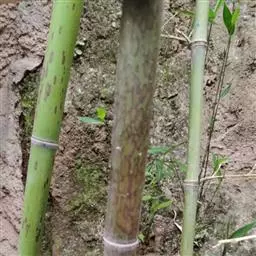 除保留分枝3-5个节的小段外其余枝叶全部剪除。对于选中的分枝,在同一母竹上,竹秆的上、中、下部位节上发育的枝芽质量是完全不同的。一般而言,上部竹节分枝较好,但因母竹上部直径小,节间短,贮藏养分少,竹芽发笋消耗养分后易退笋。母竹下部由于受光少,主枝发育不良,甚至无主枝和芽,仅有的分枝也普遍较为瘦弱。母竹中部各节分枝发育良好,隐芽饱满充实,生活力强,生长快,竹秆贮藏养分丰实,埋植后成活率较高,此部分是最理想的连秆埋枝育苗繁殖材料。