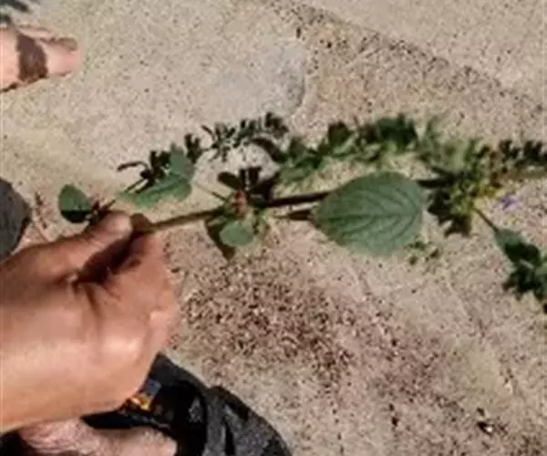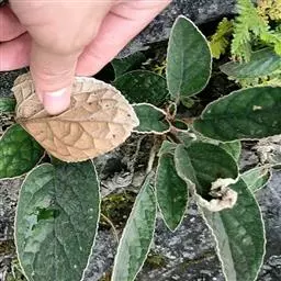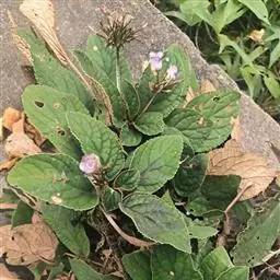 小灌木。茎常弯曲,高达30厘米,幼枝具褐色毡毛,节间短。叶对生,具叶柄;叶片长圆形,长圆状倒披针形或披针形,长5.5-25厘米,宽2.4-9厘米,顶端短尖,基部楔形或宽楔形,边缘生小钝齿或近全缘,幼时上面被灰白色或淡褐色绵毛,后变近无毛,下面密被淡褐色毡毛,侧脉每边10-13条,下面隆起;叶柄长3-6厘米,被褐色毡毛。聚伞花序伞状,成对腋生,具10余花;花序梗长2.5-5.5厘米,密被褐色毡毛;苞片2,圆卵形,长1-1.5厘米,宽9-12毫米,顶端钝,基部合生,全缘;花梗长8-10毫米,具短绵毛。花萼绿白色,常带紫色,5裂至近基部,裂片相等,倒披针状匙形,长8-13毫米,宽4-6毫米,顶端圆形,全缘,两面近无毛。花冠紫蓝色,长1.5-2厘米,直径约1.5厘米,外面无毛;筒长1-1.3厘米;檐部广展,稍二唇形,上唇比下唇略短,2裂,裂片相等,近圆形,长约7毫米,宽约5毫米,下唇3裂,裂片相等,近圆形,长约5毫