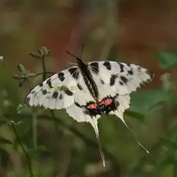 阿波罗绢蝶:翅展约7-8.4厘米。前翅较圆,白垩色,翅表有许多黑点、灰白斑及无鳞透明区,…