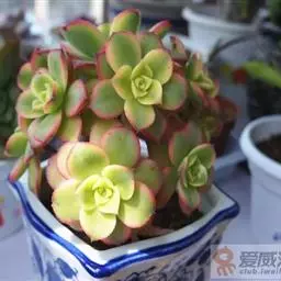 红缘莲花掌属蔷薇目、景天科植物,原产大西洋的加那利群岛。质厚,蓝绿色,被白霜,叶缘红褐色。聚伞花序,…