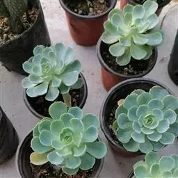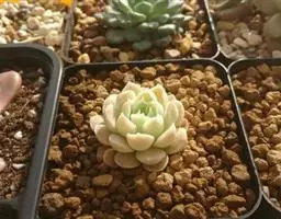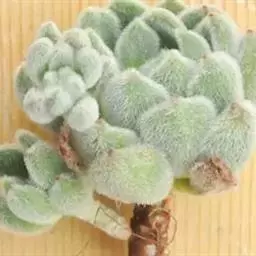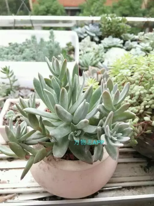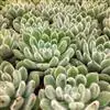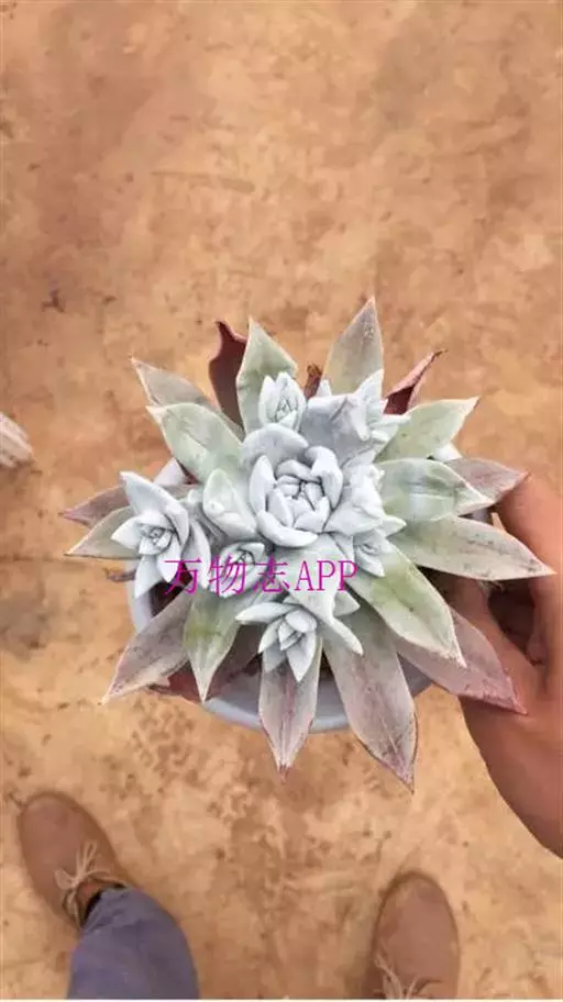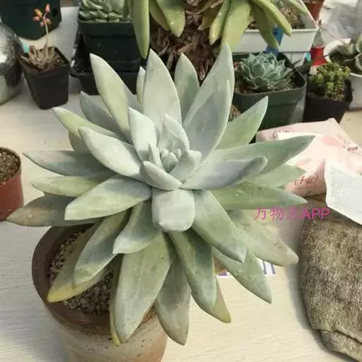 仙女杯白菊为小型仙女杯品种,易群生,茎短且粗壮,老桩适合做多肉盆景。叶片形态为长锥型,较厚质,叶色为灰绿色,表面带有粉,尤以叶片前端的粉末较多。
