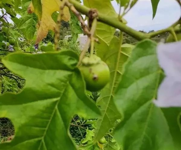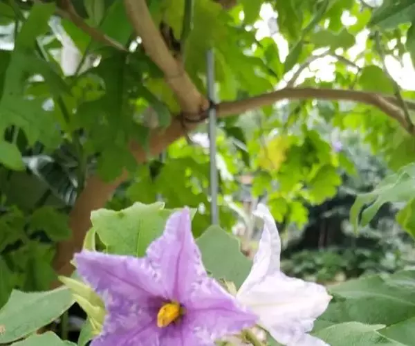 大花茄,别名木番茄,原产南美洲的玻利维亚至巴西。常绿大灌木或小乔木,株高3至5米,茎直立,小枝及叶柄具刚毛与皮刺,叶互生,叶片大、通常羽状半裂,叶面具刚毛状单毛。花腋生,花冠粉红色,果实大。