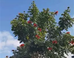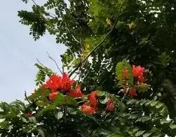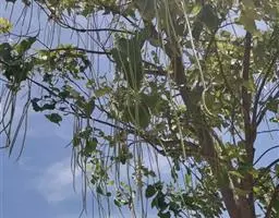 菜豆树,别名:山菜豆、苦苓舅、豇豆树、辣椒树、接骨凉伞、森木凉伞、朝阳花、牛尾木、豆角木、牛尾豆、蛇仔豆、鸡豆木、大朝阳、跌死猫树,拉丁文名:Radermachera sinica (Hance) Hemsl.),紫葳科、菜豆树属小乔木,叶柄、叶轴、花序均无毛。2回羽状复叶,稀为3回羽状复叶,小叶卵形至卵状披针形,顶端尾状渐尖,基部阔楔形,全缘,向上斜伸,两面均无毛。性喜高温多湿、阳光足的环境,生于山谷或平地疏林中;在中国的热带地区如广东、台湾等地分布,在国外的印度、菲律宾等国也有分布。根、叶、果入药,可凉血消肿,治高热、跌打损伤、毒蛇咬伤。木材黄褐色,质略粗重,年轮明显,可供建筑用材。枝、叶及根又治牛炭疽病。