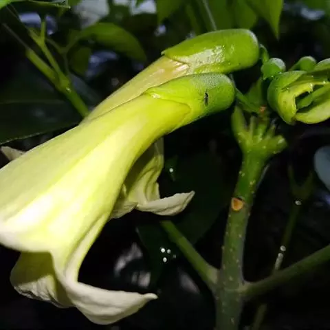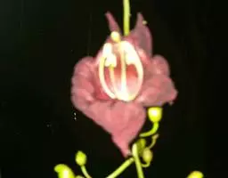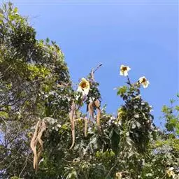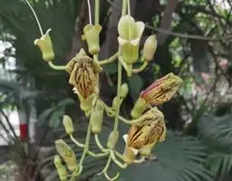 叶轴长约30厘米左右;小叶卵形至卵状披针形,长4-7厘米,宽2-3.5厘米,顶端尾状渐尖,基部阔楔形,全缘,侧脉5-6对,向上斜伸,两面均无毛,侧生小叶片在近基部的一侧疏生少数盘菌状腺体;侧生小叶柄长在5毫米以下,顶生小叶柄长1-2厘米。顶生圆锥花序,直立,长25-35厘米,宽30厘米;苞片线状披针形,长可达10厘米,早落,苞片线形,长4-6厘米。花萼蕾时封闭,锥形,内包有白色乳汁,萼齿5,卵状披针形,中肋明显,长约12毫米。花冠钟状漏斗形,白色至淡黄色,长约6-8厘米左右,裂片5,圆形,具皱纹,长约2.5厘米。雄蕊4,2强,光滑,退化雄蕊存在,丝状。子房光滑,2室,胚珠每室二列,花柱外露,柱头2裂。蒴果细长,下垂,圆柱形,稍弯曲,多沟纹,渐尖,长达85厘米,径约1厘米,果皮薄革质,小皮孔极不明显;隔膜细圆柱形,微扁。种子椭圆形,连翅长约2厘米,宽约5毫米。花期5-9月,果期10-12月。