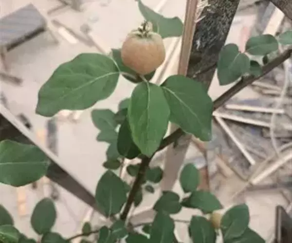 果实扁圆形,纵径6.3cm,横径7.4cm。果梗有绿色瘤状凸起,果皮绿黄色或黄色,与大榅桲相近似。果面纵沟10条极为明显。毡茸薄,深黄色。萼洼深广,有残存花瓣。果肉黄色,味甜香,微带酸味,肉较大榅桲松,水分多,种子黑褐色。