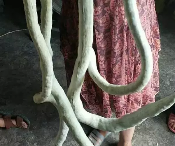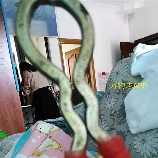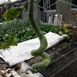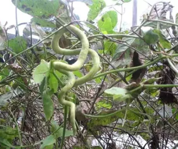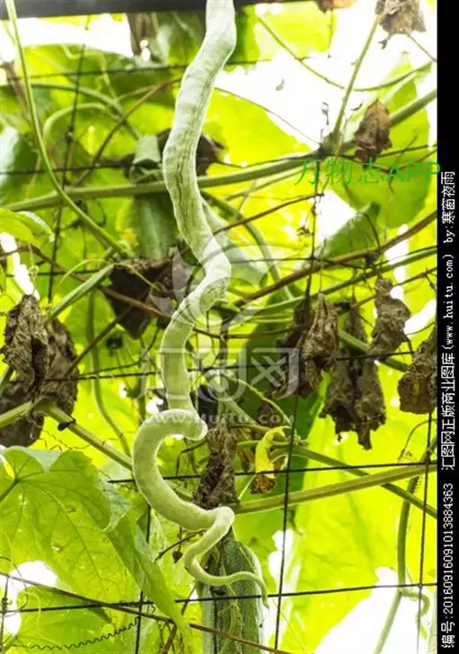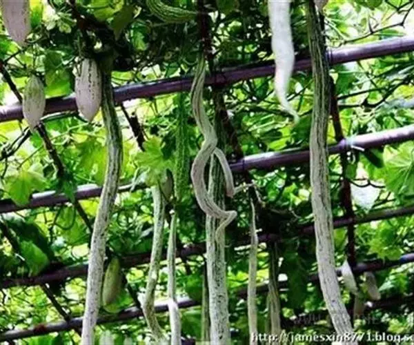 蛇瓜自瓜柄开始有数条绿色线纹,瓜体有的垂直,有的弓身,有的弯曲,有的卷尾,酷似—条条长蛇在棚架下展姿。在嫩瓜期,瓜体表面有白绿色相间的条纹似白花蛇,老熟后的瓜体表面又呈现红绿色相间的条纹似红花蛇,体态各异,栩栩如生,稀奇而美观。