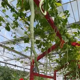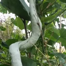 搭架整枝蛇瓜藤蔓发达,生长茂盛,分枝能力强,且瓜条较长,所以需要搭篱架或棚架,当瓜蔓长超过30厘米时,要及时绑蔓、引蔓上架。蛇瓜连续坐果能力强,它的主蔓侧蔓都结瓜,但一般主蔓结瓜,瓜条大,畸形瓜少侧蔓结瓜,瓜条小,畸形瓜多,所以可根据栽培方式及上市早晚适当修剪侧蔓。上市越早、栽培模式越精细的,侧蔓修剪越彻底,一般每株可留2-3根侧蔓,日光温室可将侧蔓全部剪去,只留主蔓结瓜。蛇瓜植株基部节位着生雄花序,上部雌花节位也着生雄花序,这些雄花序消耗大量的养分,所以需要疏去基部和雌花节位上的雄花序,摘除部分卷须,集中养分供给雌花,促进结瓜。