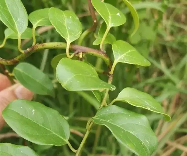 落叶攀援木质藤本;嫩枝绿色,被细柔毛,老枝紫褐色,具白蜡层,常留有木质化成单刺状或双刺状的叶柄基部。芽鳞阔卵形,具缘毛。叶近纸质,卵状椭圆形、卵形或阔卵形,长3.5-9厘米,宽2-4.5厘米,叶面深绿色,中脉有稀疏毛,叶背带白色,脉上被稀疏柔毛,侧脉每边3-5条;叶柄长2-5毫米,被柔毛。
