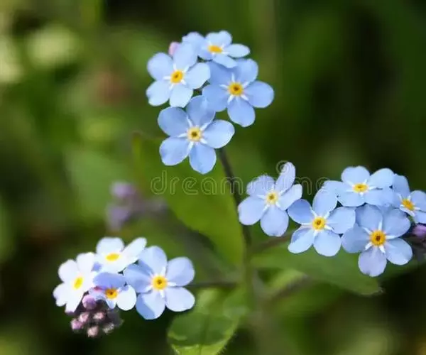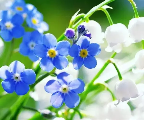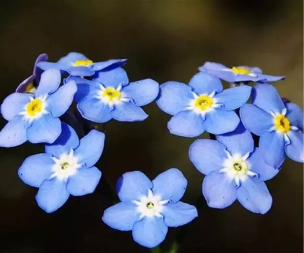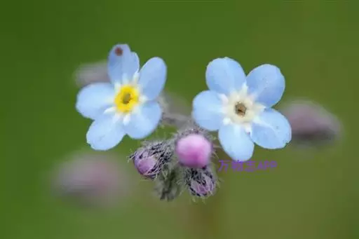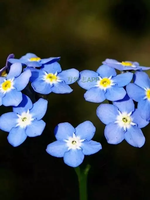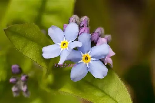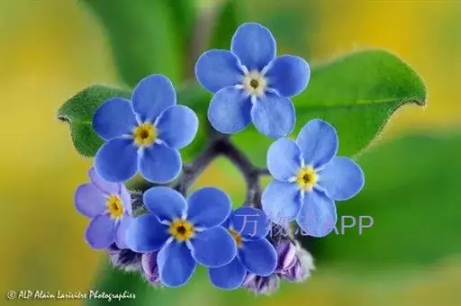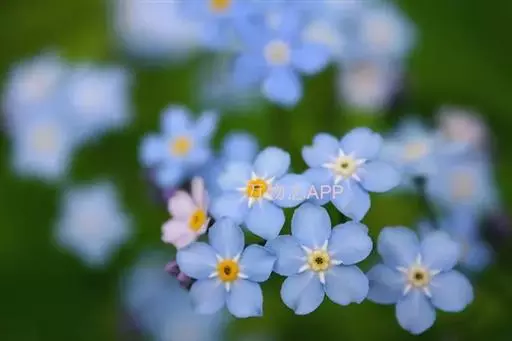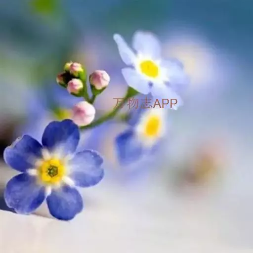 勿忘草 勿忘草株形柔美,茎枝纤细,叶片的形状很像柳树的叶子,无数朵小蓝花开满茎顶部的每个小枝,花瓣的蓝色仿佛是由天空的颜色染成的让人充满无限遐想。花朵中央有一圈黄色心蕊色彩搭配非常和谐。