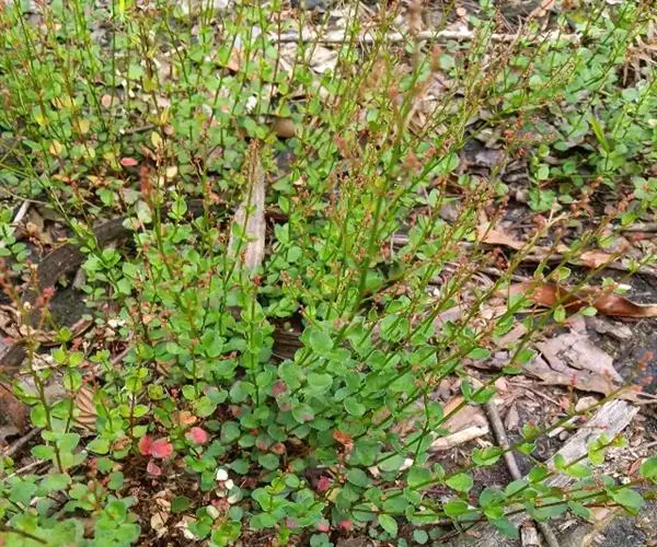 小二仙草 多年生陆生草本,高5-45厘米;茎直立或下部平卧,具纵槽,多分枝,多少粗糙,带赤褐色。叶对生,卵形或卵圆形,长6-17毫米,宽4-8毫米,基部圆形,先端短尖或钝,边缘具稀疏锯齿,通常两面无毛,淡绿色,背面带紫褐色,具短柄;茎上部的叶有时互生,逐渐缩小而变为苞片。花序为顶生的圆锥花序,由纤细的总状花序组成;花两性,极小,直径约1毫米,基部具1苞片与2小苞片;萼筒长0.8毫米,4深裂,宿存,绿色,裂片较短,三角形,长0.5毫米;花瓣4,淡红色,比萼片长2倍;雄蕊8,花丝短,长0.2毫米,花药线状椭圆形,长0.3-0.7毫米;子房下位,2-4室。坚果近球形,小形,长0.9-1毫米,宽0.7-0.9毫米,有8纵钝棱,无毛。花期4-8月,果期5-10月。