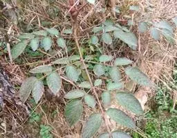 灌木或乔木,高2-5米,稀达8米,胸径达10-15厘米;树皮灰色,疏生粗壮直刺;小枝通常淡灰棕色,有黄棕色绒毛,疏生细刺。叶为二回或三回羽状复叶,长60-110厘米;叶柄粗壮,长可达50厘米;托叶与叶柄基部合生,纸质,耳廓形,长1.5厘米或更长,叶轴无刺或有细刺;羽片有小叶5-11,稀13,基部有小叶1对;小叶片纸质至薄革质,卵形、阔卵形或长卵形,长5-12厘米,稀长达19厘米,宽3-8厘米,先端渐尖或短渐尖,基部圆形,上面粗糙,疏生糙毛,下面有淡黄色或灰色短柔毛,脉上更密,边缘有锯齿,稀为细锯齿或不整齐粗重锯齿,侧脉7-10对,两面均明显,网脉在上面不甚明显,下面明显;小叶无柄或有长3毫米的柄,顶生小叶柄长2-3厘米。