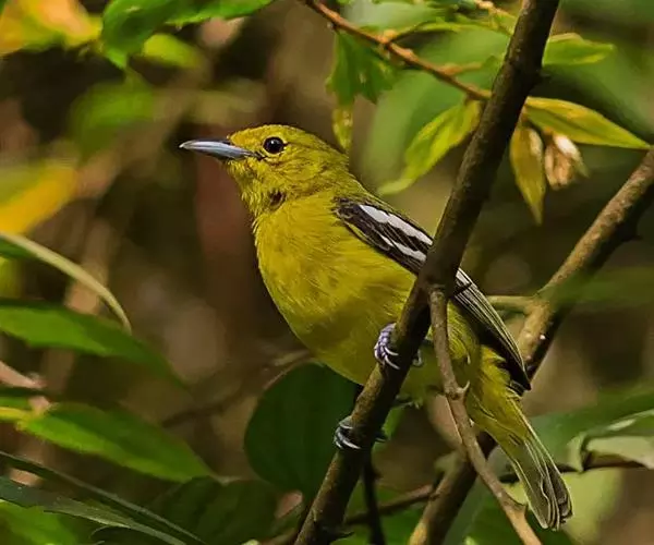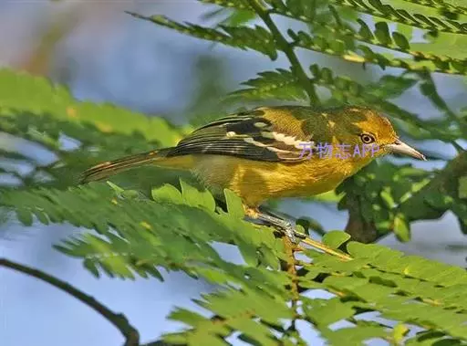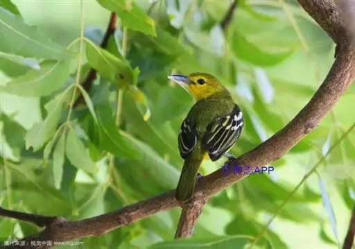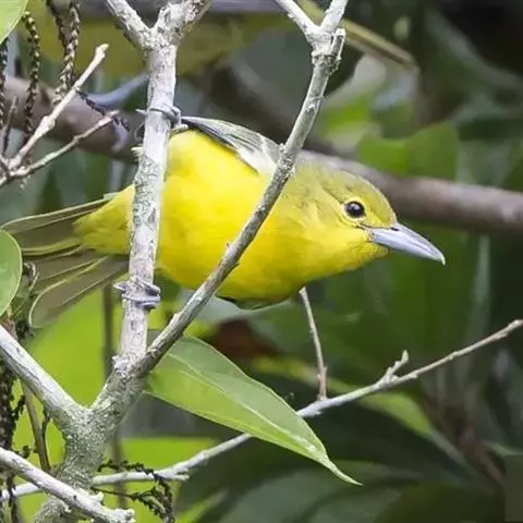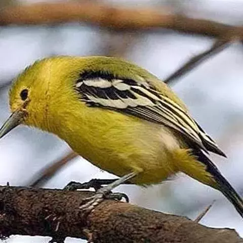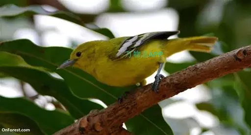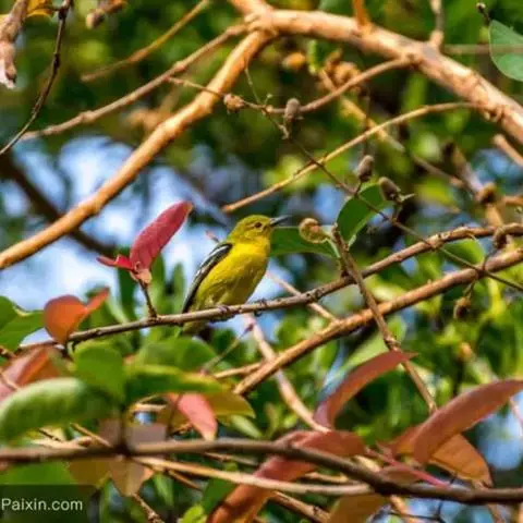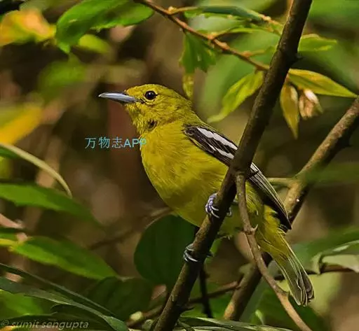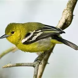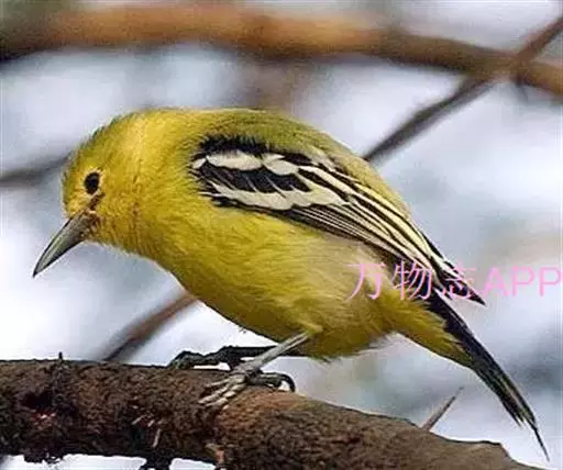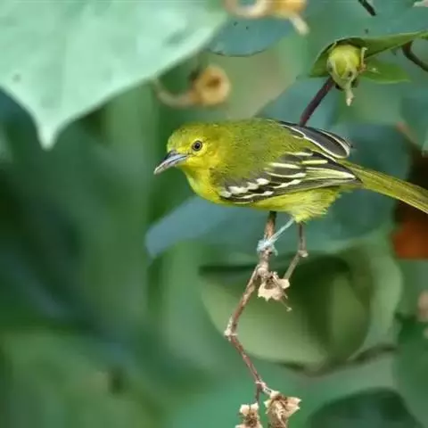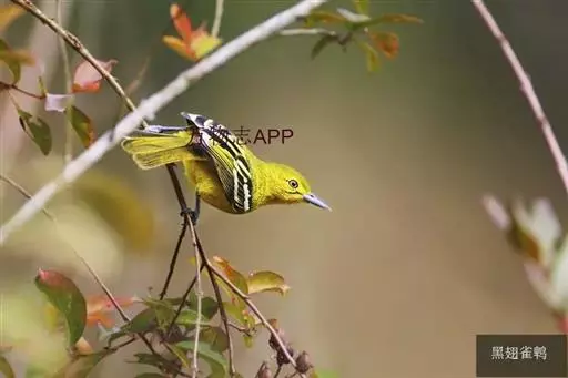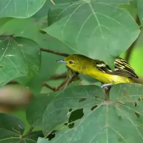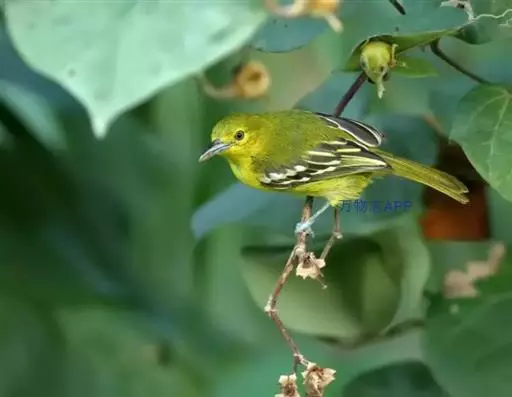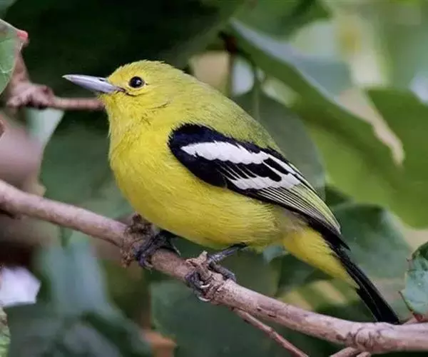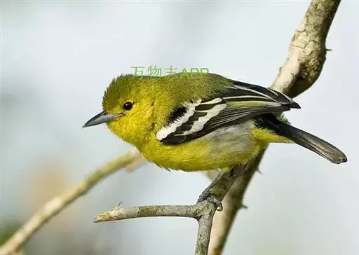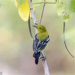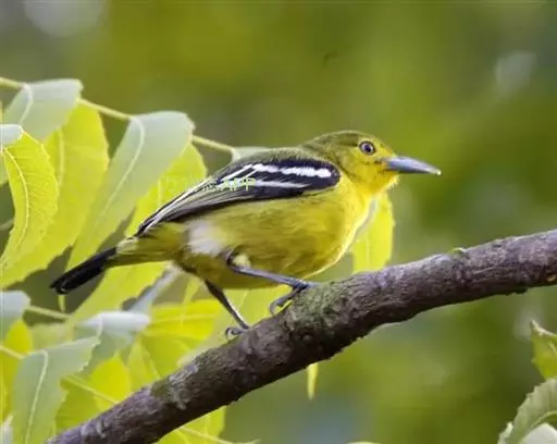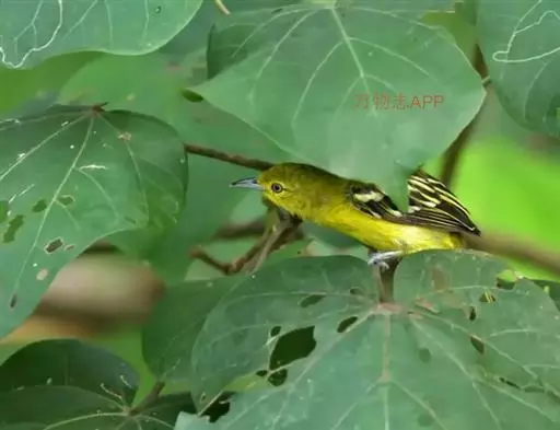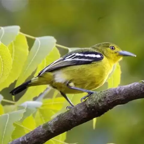 黑翅雀鹎(学名:Aegithina tiphia):体重14-19克,体长11.5-16厘米。是树栖性绿色小鸟,外形与叶鹎相似,下体黄色。鸟喙直,翼长而尖,总体羽毛是绿色和黄色相结合,翼上具两道明显近白色横纹,翼近黑而羽缘白。虹膜灰色、淡黄色或棕红色,嘴灰蓝色、银灰色或黑色,跗蹠灰色。