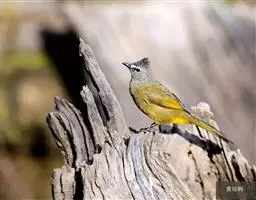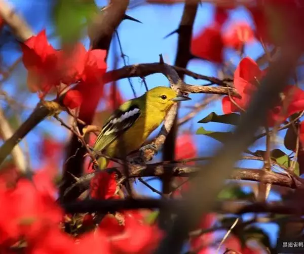 黑翅雀鹎 黑翅雀鹎的雄鸟额酪黄色,头顶橄榄黄绿色,有的枕部杂有黑色。背肩橄榄黄绿色,有时羽端或多或少杂有黑色。两翅黑色,翅上小覆羽黑色而具光泽,中覆羽和大覆羽具白色端斑,在翅上形成两道明显的白色翼斑,其中前面一道宽阔。大覆羽具浅黄色狭缘。飞羽黑色,除最外侧1-2对飞羽外,其余飞羽和初级覆羽外翈先端转白,最内侧飞羽内翈亦具白色羽缘。尾上覆羽和尾羽亮黑色。尾羽先端及外侧尾羽外翈缀橄榄黄色。