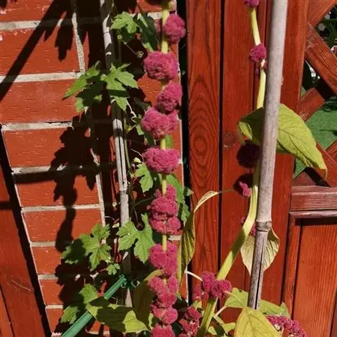 一年生草本,高80-150厘米;茎粗壮,绿色或红色,常分枝,幼时有毛或无毛。 苋 叶片卵形、菱状卵形或披针形,长4-10厘米,宽2-7厘米,绿色或常成红色,紫色或黄色,或部分绿色加杂其他颜色,顶端圆钝或尖凹,具凸尖,基部楔形,全缘或波状缘,无毛;叶柄长2-6厘米,绿色或红色。花簇腋生,直到下部叶,或同时具顶生花簇,成下垂的穗状花序; 花簇球形,直径5-15毫米,雄花和雌花混生;苞片及小苞片卵状披针形,长2.5-3毫米,透明,顶端有1长芒尖,背面具1绿色或红色隆起中脉;花被片矩圆形,长3-4毫米,绿色或黄绿色,顶端有1长芒尖,背面具1绿色或紫色隆起中脉;雄蕊比花被片长或短。胞果卵状矩圆形,长2-2.5毫米,环状横裂,包裹在宿存花被片内。种子近圆形或倒卵形,直径约1毫米,黑色或黑棕色,边缘钝。花期5-8月,果期7-9月。