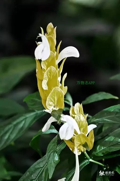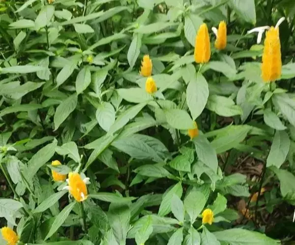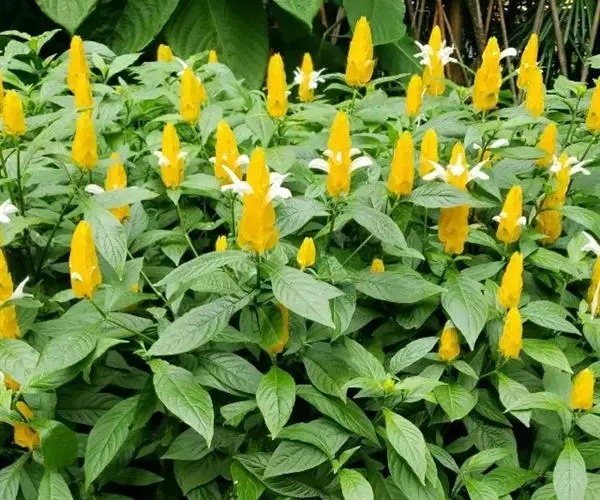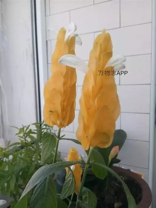 常绿灌木,高达1米,多分枝。叶对生,狭卵形,长达12厘米,亮绿色,叶面皱褶有光泽。穗状花序顶生,长达10-15厘米,直立:苞片心形、金黄色,排列紧密,花白色,唇形,长约5厘米,从花序基部陆续向上绽开,金黄色苞片可保持2-3个月。 金苞花