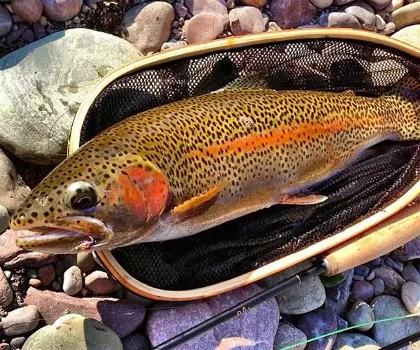 虹鳟鱼性成熟个体沿侧线有1条呈紫红色和桃红色、宽而鲜红的彩虹带,直沿到尾鳍基部,在繁殖期尤为艳丽。似彩虹,故名。鱼体呈纺锤状,略侧扁。有一脂鳍,体色美丽。体侧有一条棕红色纵带,状似彩虹。体型侧扁,口较大,斜裂,端位。吻圆钝,上颌有细齿。背鳍基部短,在背鳍之后还有一个小脂鳍。胸鳍中等,末端稍尖。腹鳍较小,远离臀鳍。鳞小而圆。背部和头顶部蓝绿色、黄绿色和棕色,体侧和腹部银白色、白色和灰白色。头部、体侧、体背和鳍部不规则的分布着黑色小斑点。