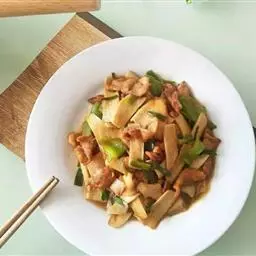 1、炒锅放少许油,放姜片、放入切片的五花肉,用小火煸炒至五花肉吐油且肥的部份变透明。