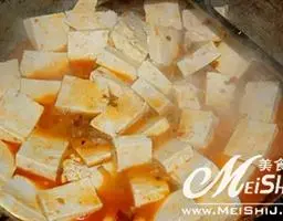 3、将做法(二)放入石锅,放改刀成块状的豆腐,加入鸡精、盐、白糖调味,大火烧开后改小火再炖十分钟。