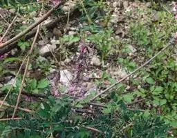 总状花序腋生,长4-6(-8)厘米;总花梗较叶柄短;苞片线形,长约1.5毫米;花梗长约1毫米;花萼长约2毫米,外面被白色丁字毛,萼齿近相等,三角状披针形,与萼筒近等长;花冠紫色或紫红色,旗瓣阔倒卵形,长达5毫米,外面被丁字毛,翼瓣与龙骨瓣等长,龙骨瓣有距;花药圆球形,先端具小凸尖;子房线形,被疏毛。荚果褐色,线状圆柱形,长不超过2.5厘米,被白色丁字毛,种子间有横隔,内果皮有紫红色斑点;种子椭圆形。花期5-6月,果期8-10月。